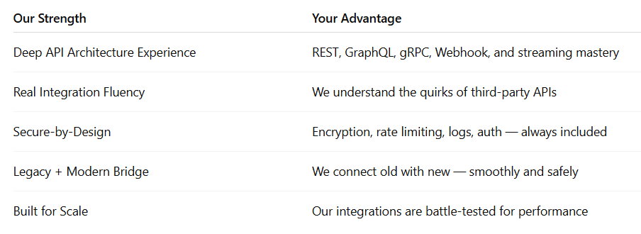 We specialize in REST, GraphQL, SOAP, WebSocket, and event-driven architectures — ensuring your systems are not just connected, but intelligently orchestrated.