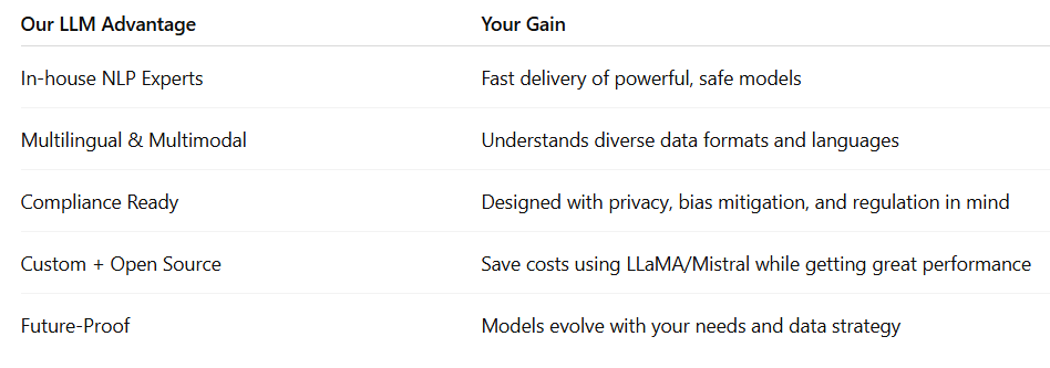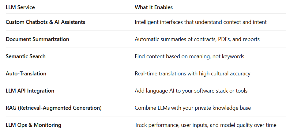 From building custom GPT-style assistants to deploying LLM APIs securely in your environment, we help businesses unlock the power of language AI to revolutionize how people interact with technology — through words, context, and conversation.